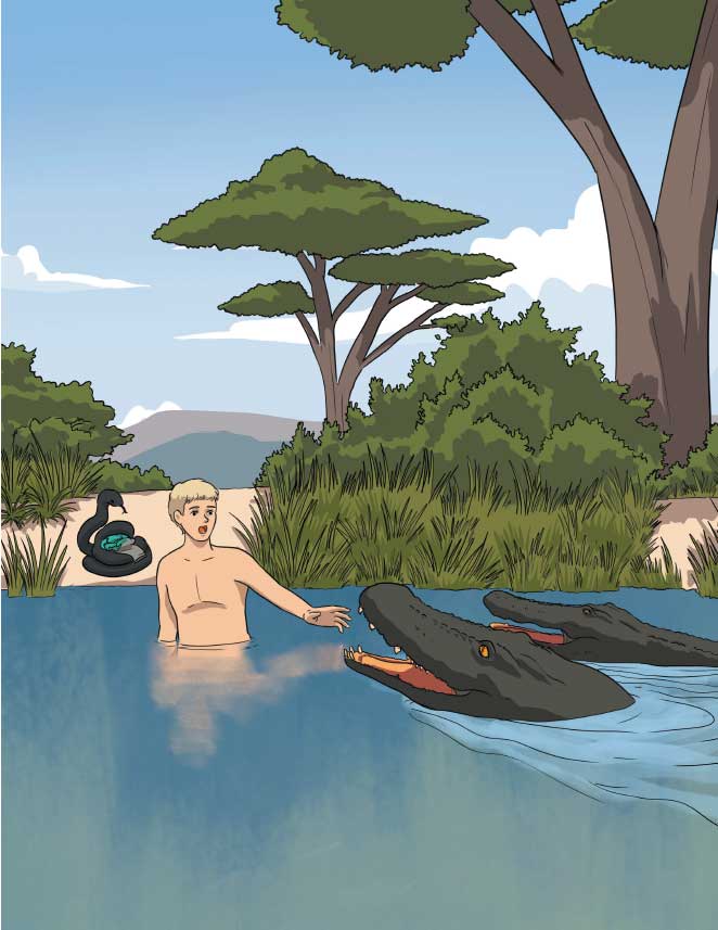 Ross wondered what part of him the crocs would eat first and what it would taste like. The croc facing the bank looked bigger and hungrier and moved closer to Ross. It opened its huge mouth, teeth glistening and terrifying.