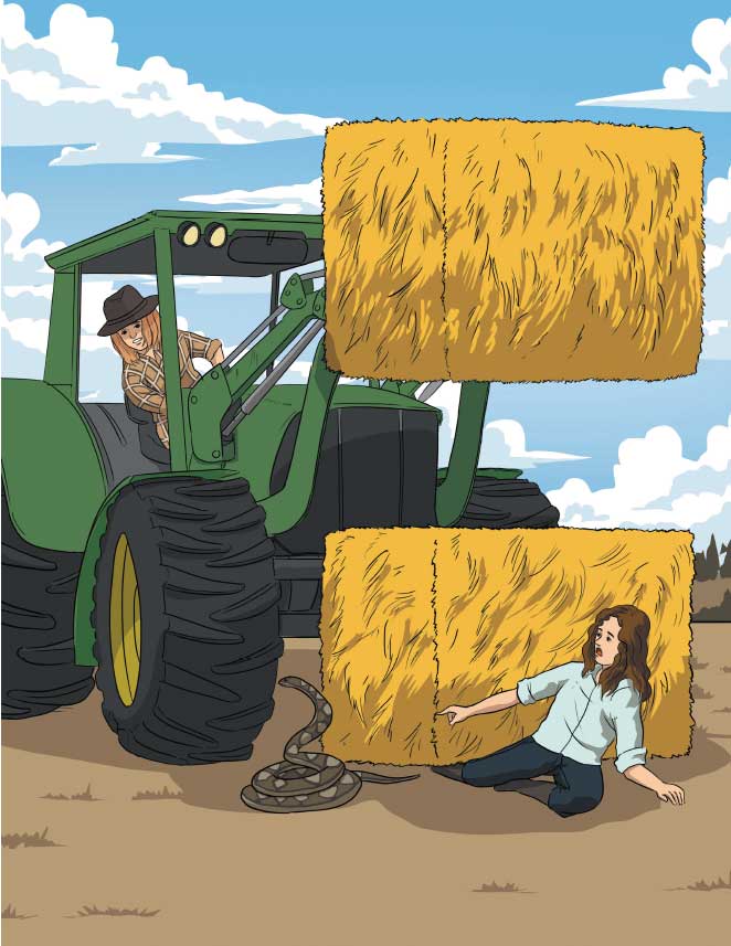 Maree had just started to move the bale where Slithers was, by pushing it along the floor, when Imogen ran in front of the tractor.  She had realised that Slithers had not become aware of the tractor and Imogen had to protect and save him.  Maree braked hard not to hurt Imogen and some bales fell off the tractor’s front forks onto Imogen.